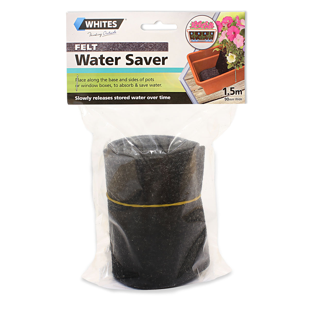 Whites Felt Water Saver slowly releases stored water over time as your plants require. Simply place along the base and sides of pots or window boxes to absorb and save water.